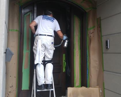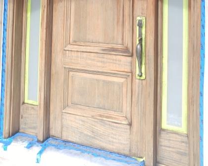 Most people ask us if we’re going to take the door off and take it away to refinish it. We could do that but then you’d be left with a big hole in the front of your house.  So even if we had a shop and even if we could get your door off the hinges, safely onto a truck and taken to a shop (that we don’t have), we’d need to charge you to fill the hole with either a temporary door or block it off with a big piece of plywood.