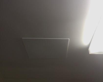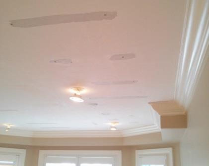 These pictures illustrate that stucco that hasn’t been painted comes off easily with a scraper once we wet it down first. The next step in a conversion to a flat ceiling is allowing for plaster repairs. Stucco usually covers a multitude of problems such as sub-standard drywall/taping installation or worse, ceiling damage. The time to repair the ceiling is usually two to three times longer than to remove the stucco but the results are a smooth surface and a more modern look to a home.