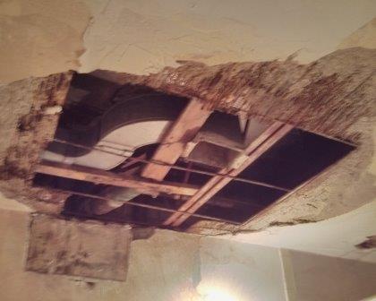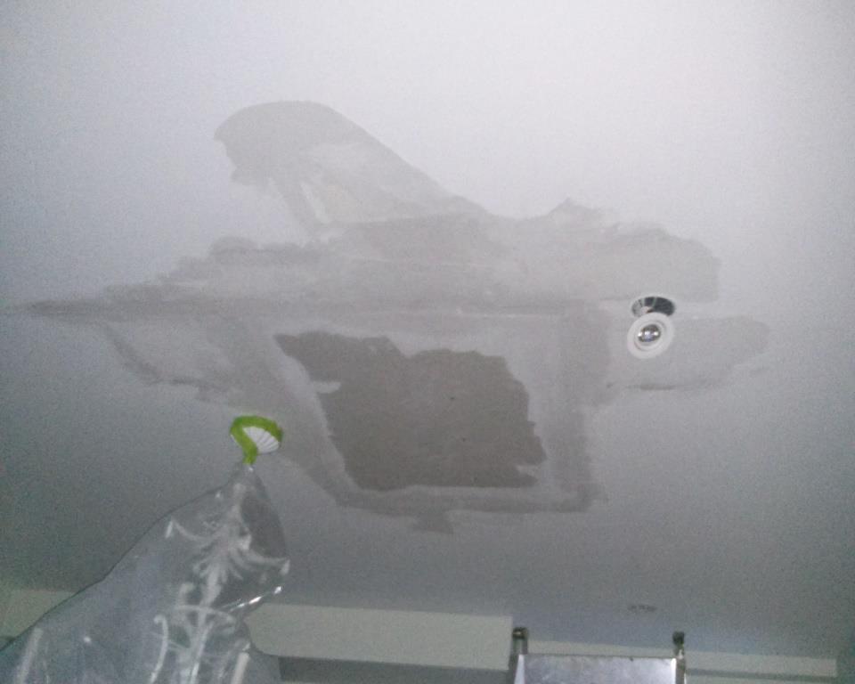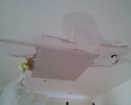 The sad truth is that water doesn’t necessarily flow downhill, or in this case, straight down from where it leaked above. Water follows the path of least resistance and while it does that it soaks into, seeps into and generally wrecks everything in its’ path. So that small leak can cause damage across a wide area especially when it comes to ceilings. The only way to fix it is to remove loose plaster and old paint build-up, seal the area with a stain-blocking primer/sealer and then re-plaster.