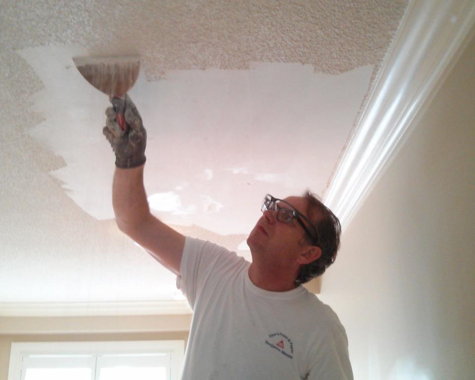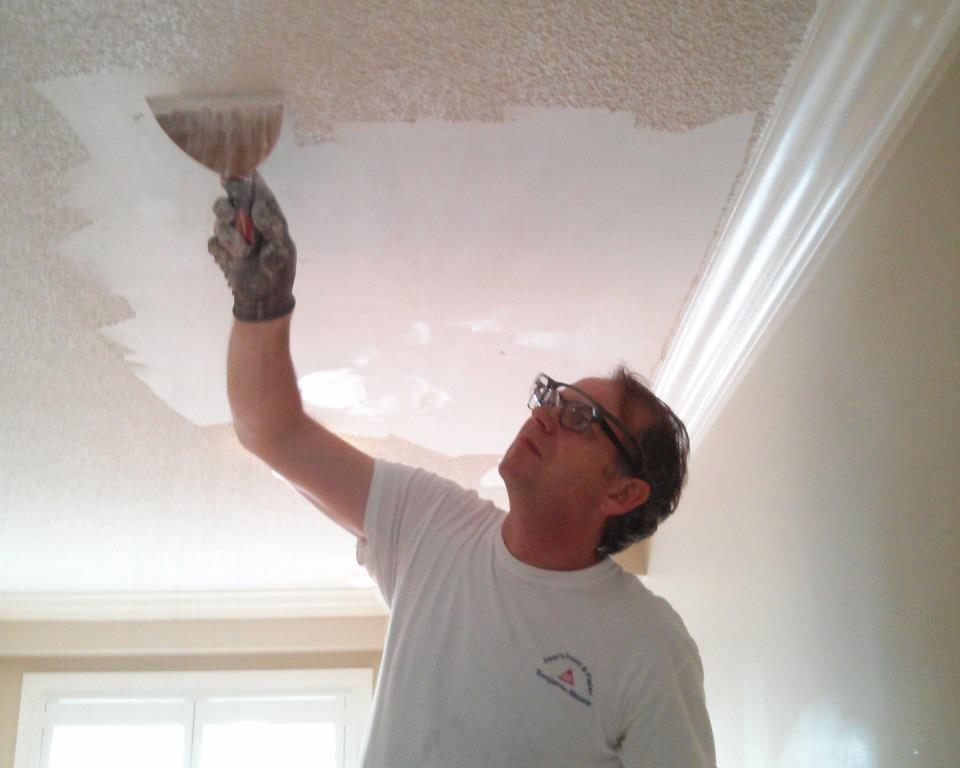 This is a specialized area and we only take on one part of this type of work. We can remove stucco from ceilings (and walls) that has not been painted before. A new stucco surface is applied using a spray-on application and it’s relatively easy to remove as long as it has never been painted over before or, was installed without the addition of paint to the mix when applied. Once it’s been painted over it’s very hard and difficult to remove and you’ll need to call a contractor who can grind it off and re-apply a new smooth plaster ceiling called a ‘skim coat’.