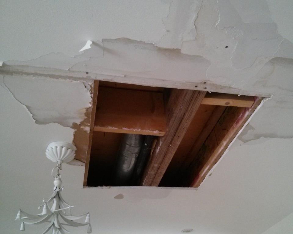 The water leak upstairs was so small; why is the damage to the ceiling on this floor so extensive?